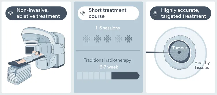Stereotactic Ablative Radiotherapy (SABR) delivers highly focused radiation therapy in just 1-5 sessions, precisely targeting cancer cells while sparing surrounding healthy tissue.