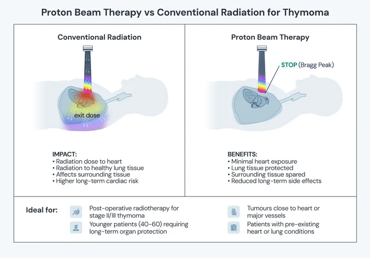 Proton beam therapy offers significant advantages for many thymoma patients, particularly those with tumors close to the heart or major vessels, younger patients where long-term side effect reduction matters most, or those requiring re-irradiation for recurrent disease.
